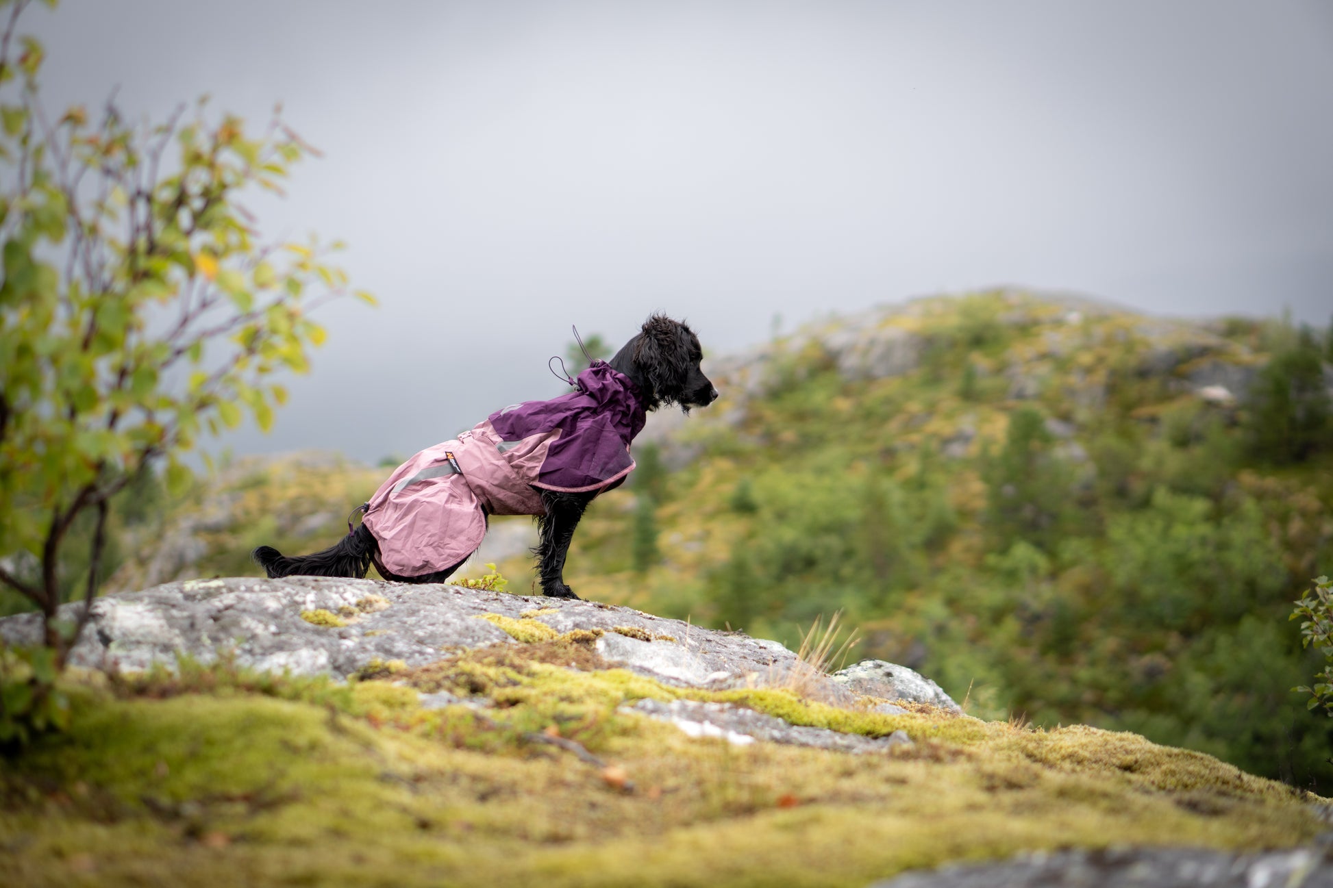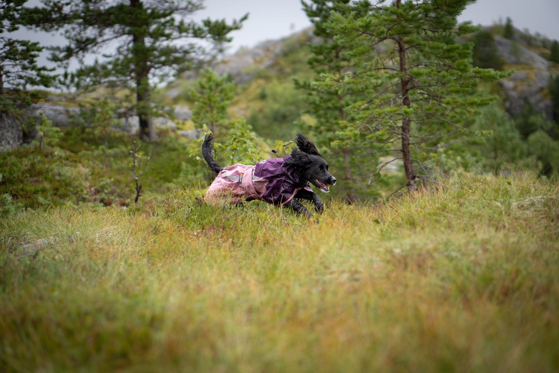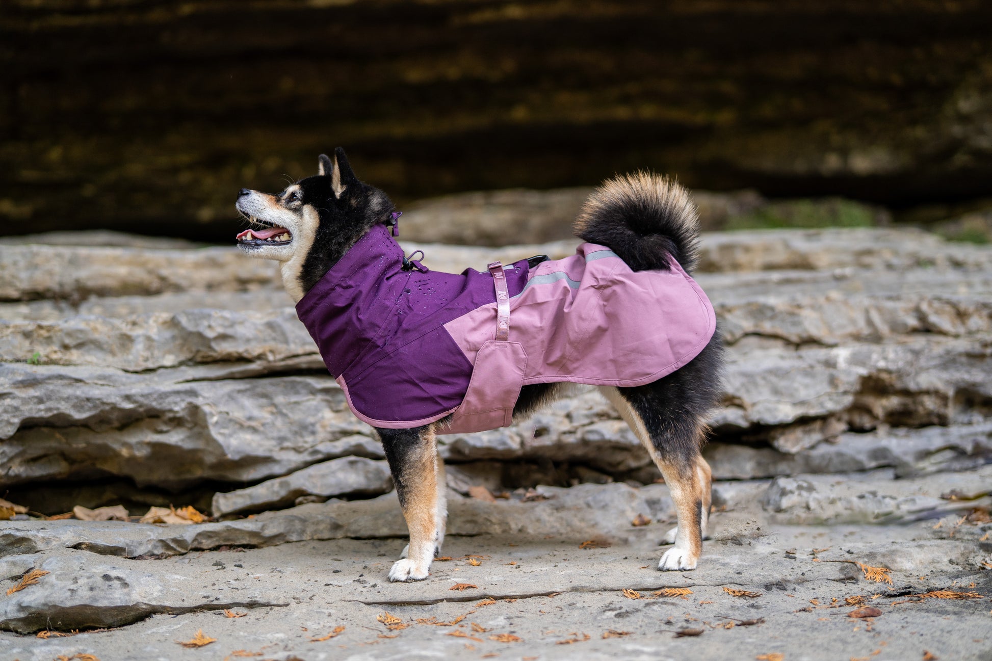 風にも雨にも強く、動きを妨げない全天候型ドッグレインコート。